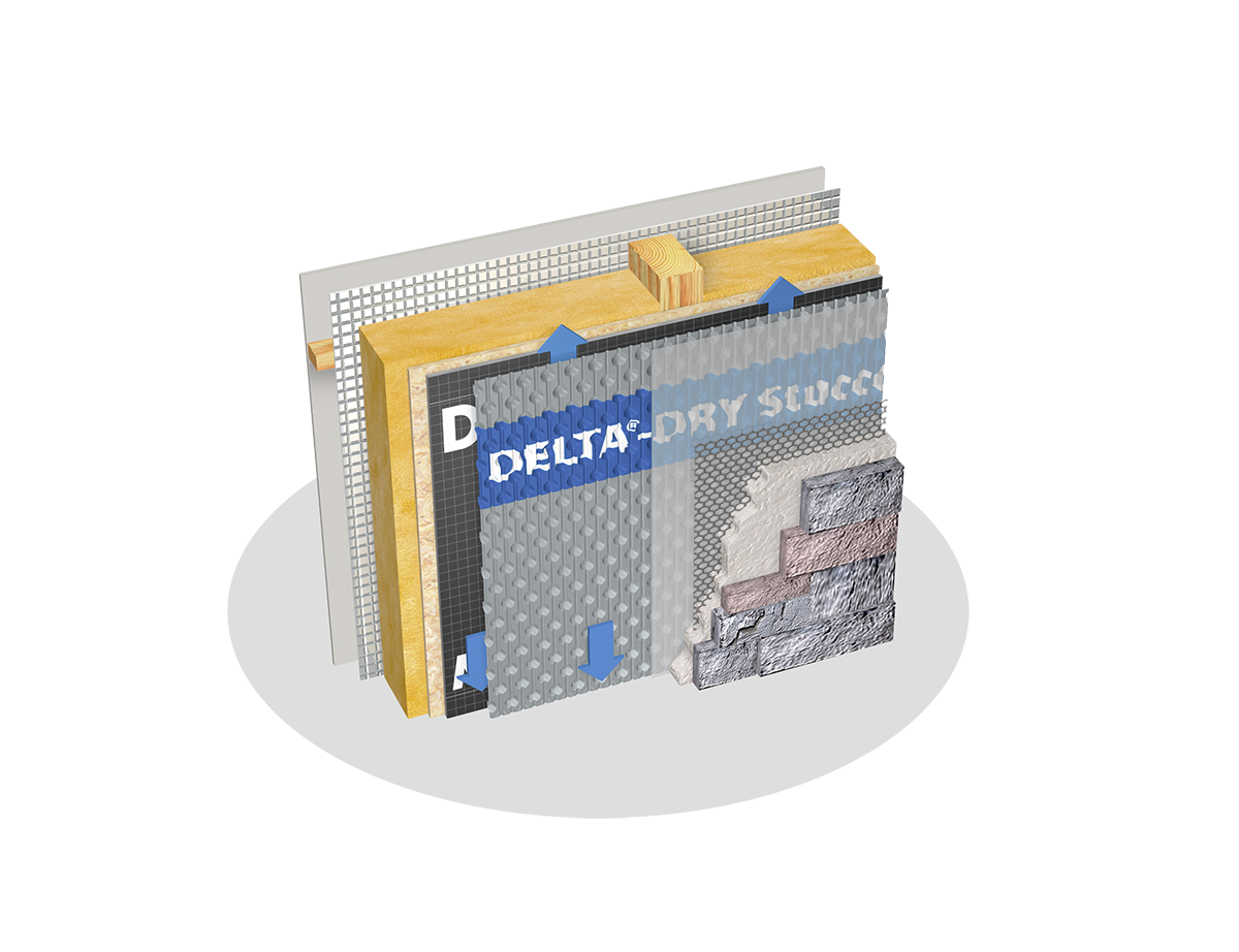 DELTA-DRY STUCCO & STONE is a ventilated rainscreen with a pre-installed mortar screen that