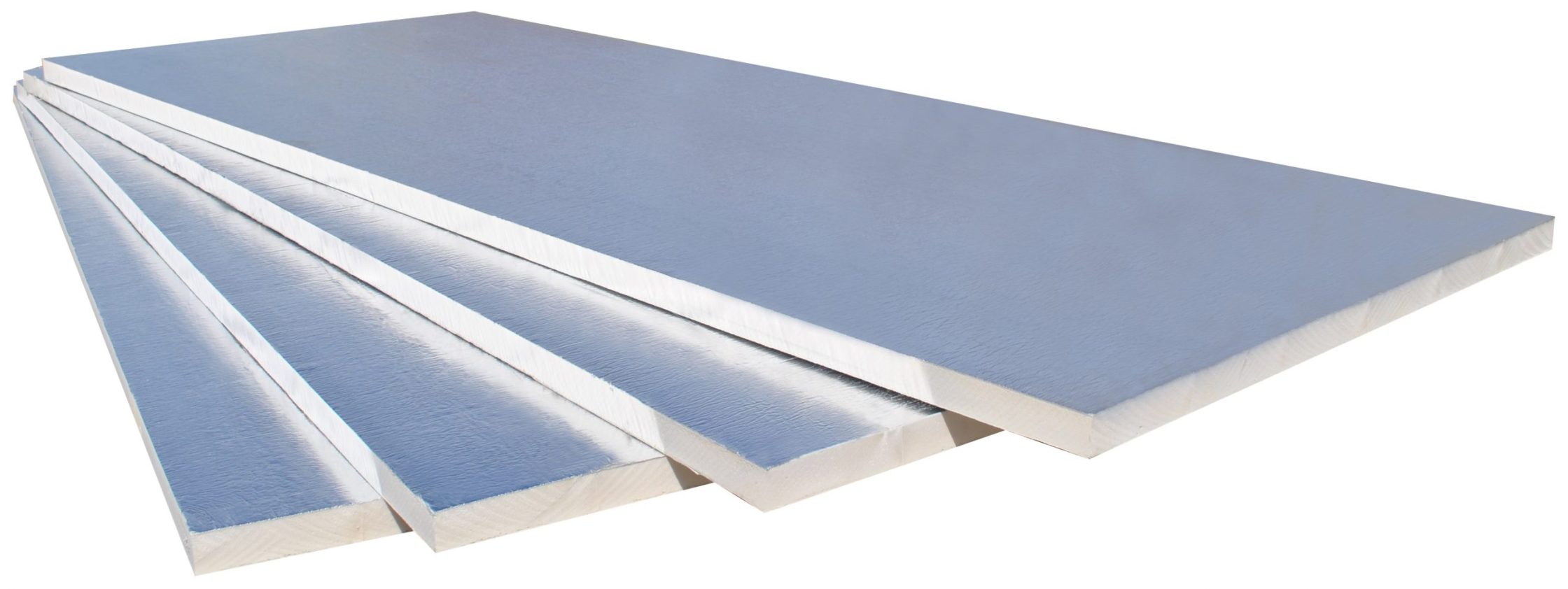 Rmax ECOMAXci FR is an energy-efficient thermal insulation board composed of a closed-cell polyisocyanurate (polyiso) foam core bonded to embossed, glass fiber reinforced aluminum facers on both sides. The exposed side of the board has a heavy embossed 12mil facer with an aluminum reflective surface and clear coating for limited protection against oxidation. The other side is marked in production to ensure proper installation.