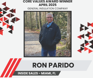 We are excited to announce April’s winner of General Insulation Company’s Core Values Award. Please take a moment to congratulate Ron Parido, Inside Sales, at the Miami, Florida branch, for being April’s Core Values Award Winner! Congratulations, Ron! Your hard work and dedication to General Insulation has been noticed. We are proud of your achievement; we look forward to your continued success and we thank you for demonstrating our Core Values!