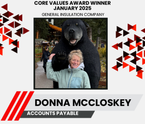 We are excited to announce January’s winner of General Insulation Company’s Core Values Award. Please take a moment to congratulate Donna McCloskey, Accounts Payable, for being January’s Core Values Award Winner! Congratulations, Donna! Your hard work and dedication to General Insulation has been noticed. We are proud of your achievement; we look forward to your continued success and we thank you for demonstrating our Core Values!