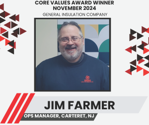 We are excited to announce November’s winner of General Insulation Company’s Core Values Award. Please take a moment to congratulate Jim Farmer, Operations Manager, Carteret, NJ branch for being November’s Core Values Award Winner! Congratulations, Jim! Your hard work and dedication to General Insulation has been noticed. We are proud of your achievement; we look forward to your continued success and we thank you for demonstrating our Core Values!